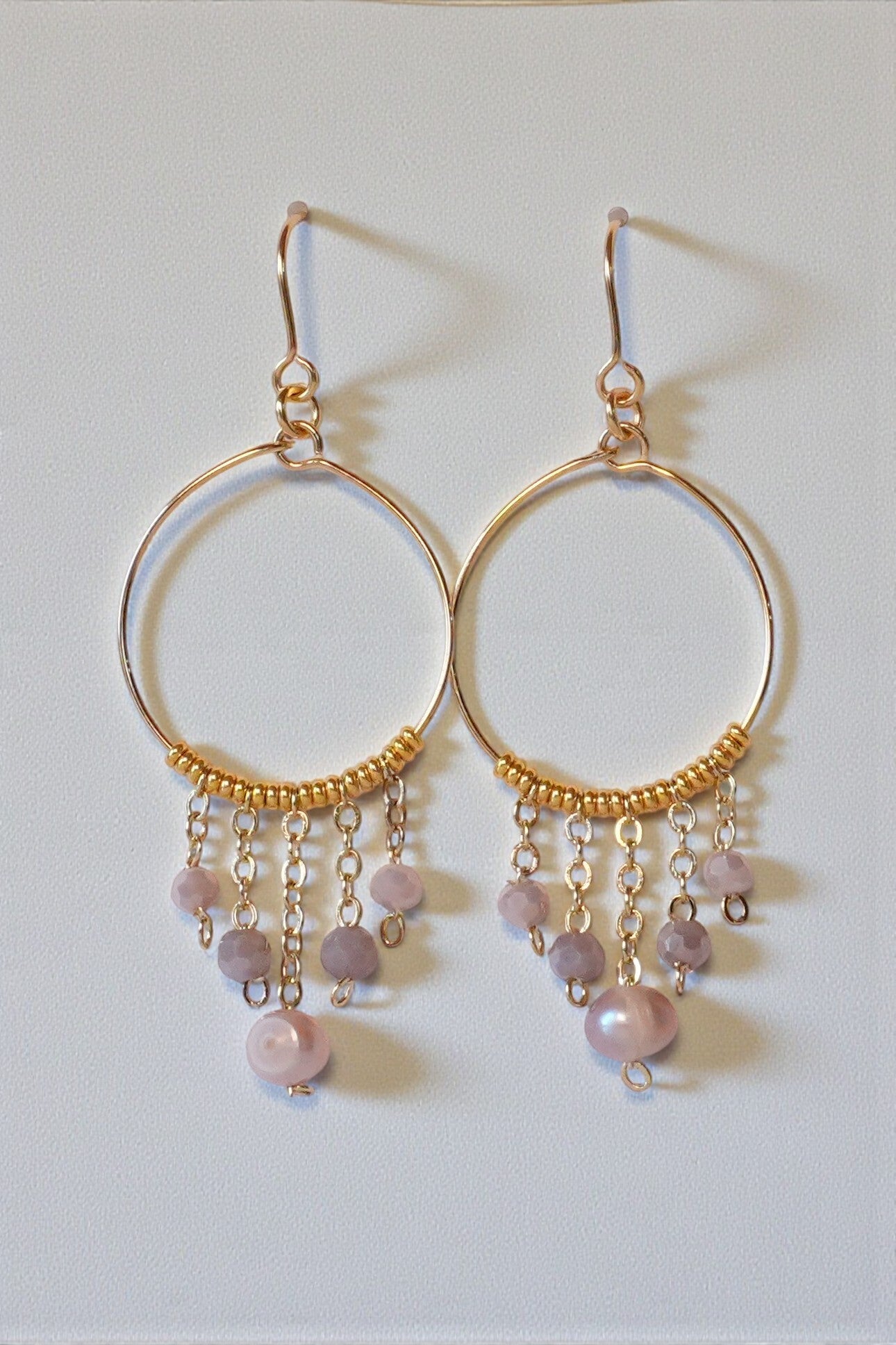 Ein zarter goldfarbener Edelstahlring kombiniert mit kleinen lilafarbenen Glasschliffperlen die in Handarbeit in vergoldete Edelstahlkettchen eingearbeitet wurden und in ihren Längen abgestuft sind. Am längsten Kettchen befindet sich jeweils eine ca. 5x6 mm große, lilafarbene Süßwasserperle.