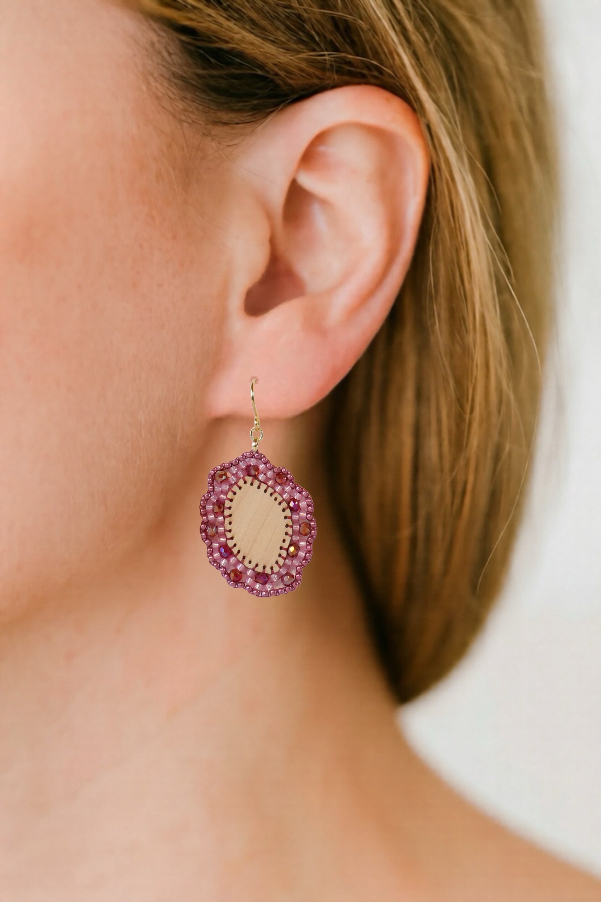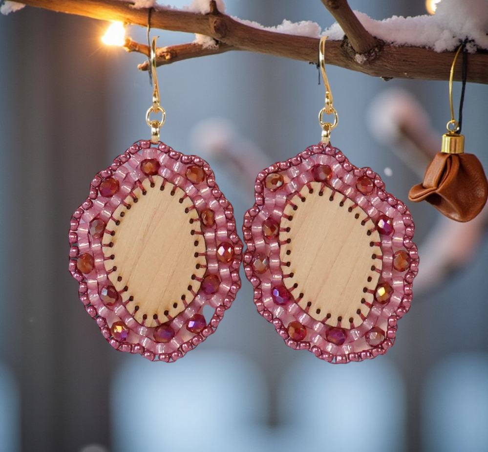 Dieser wunderschöne kleine Ohrring aus meiner Linie MA.LI.QUE wurde aus einem Zirben Holz gefertigt. Der Rand des leicht unregelmäßigen Ovals ist mit einem zweifarbigen Perlenrand aus roten und rosafarbenen Glasperlen verziert. Die roten Perlen unterstreichen die feine Maserung der Zirbe.