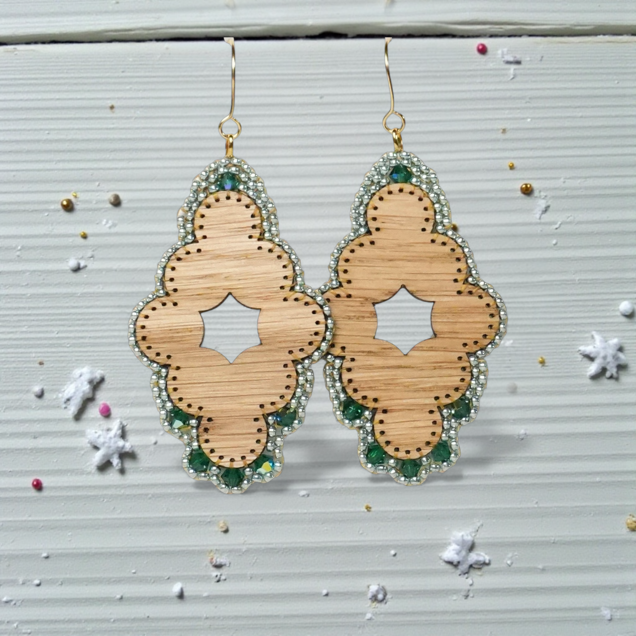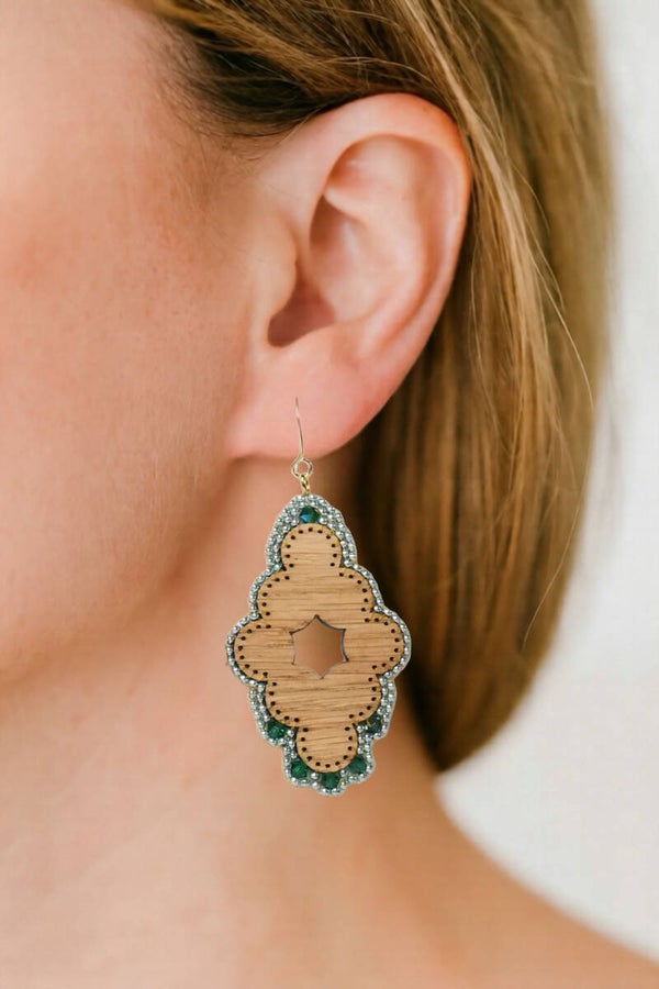 großer Hängeohrring mit Holzkern und türkisem Perlenrand
