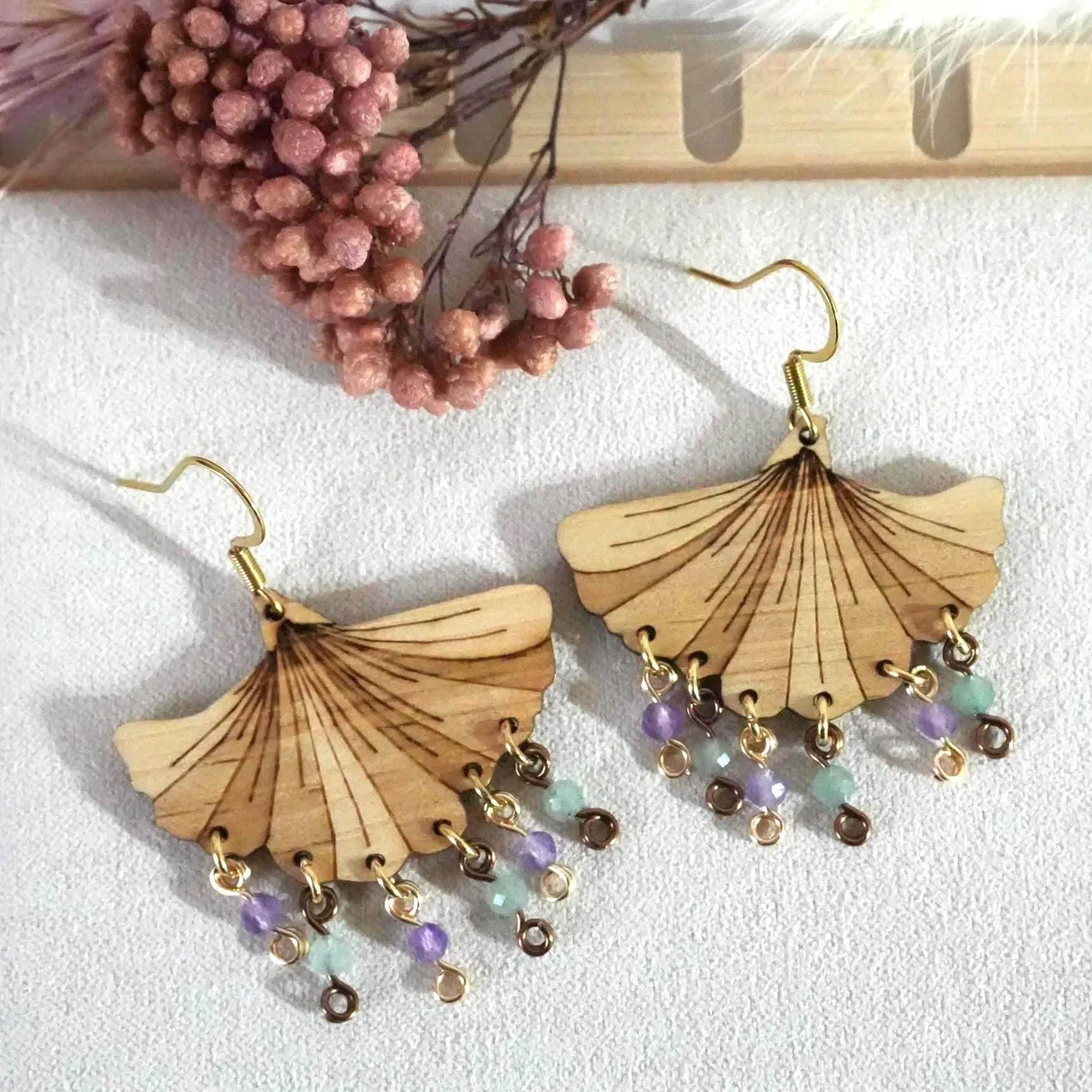 Holz Ohrring aus Zirbe in Ginkgo-Blattform mit Perlenanhängern