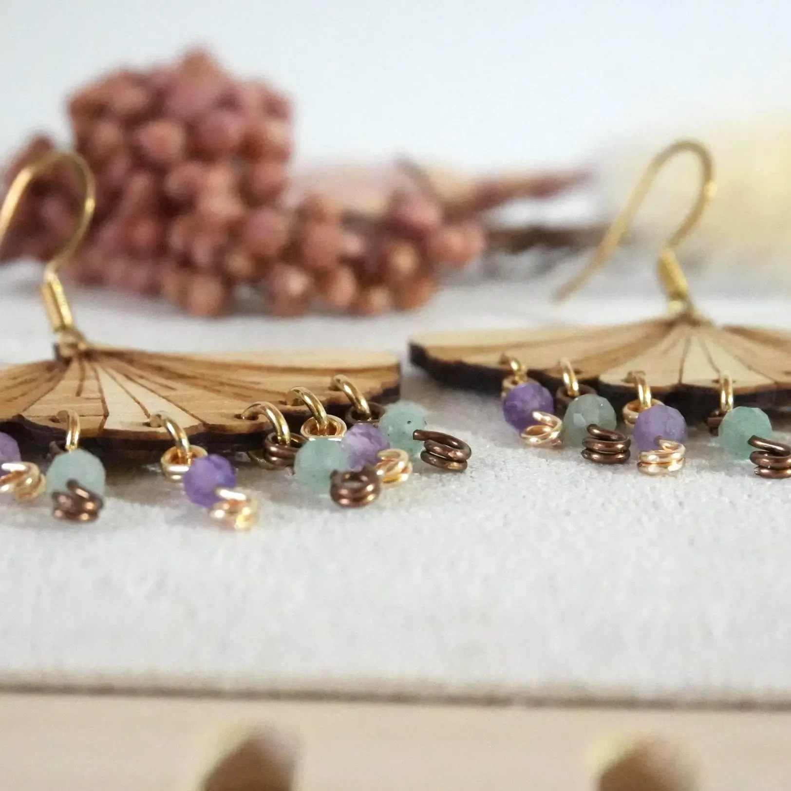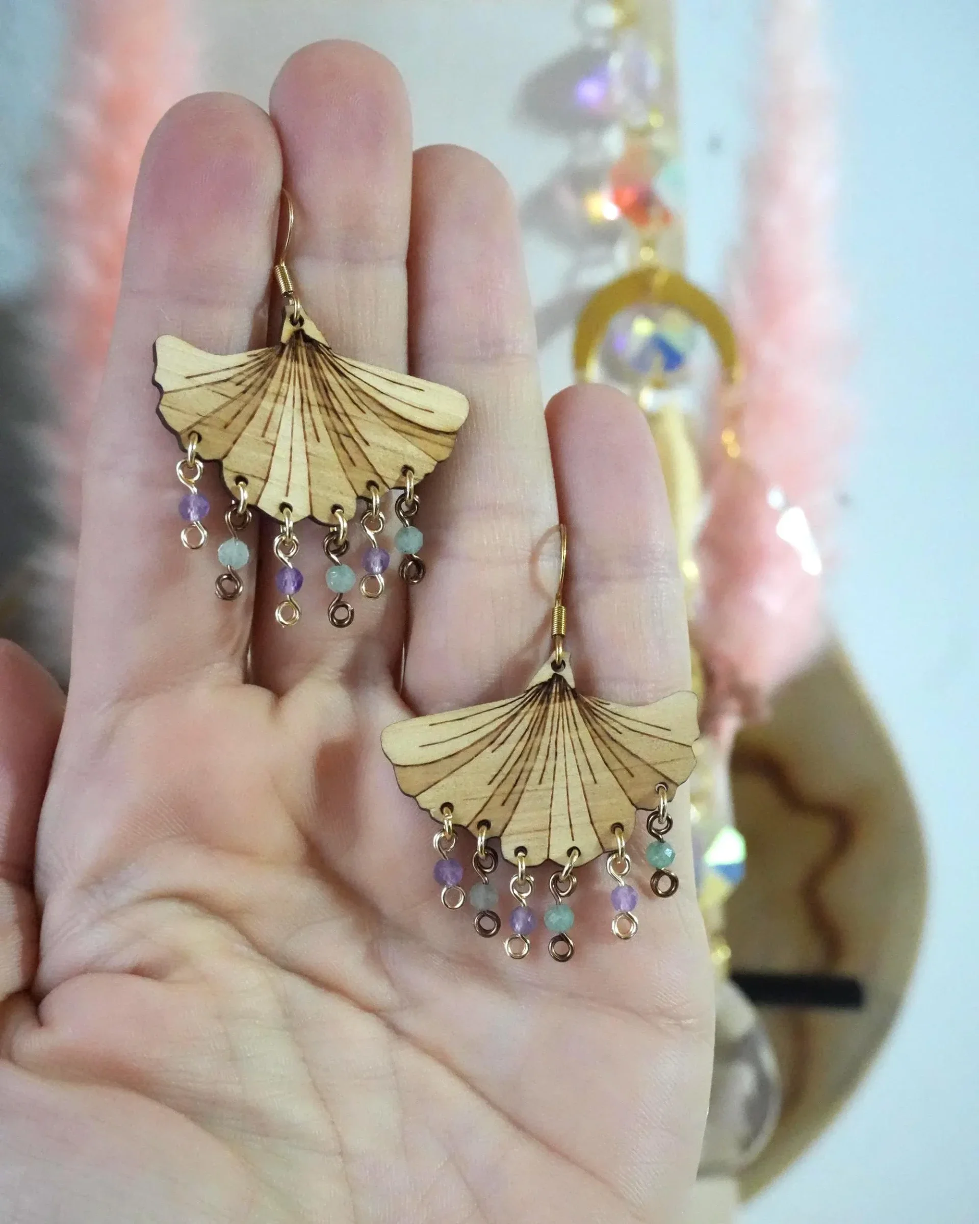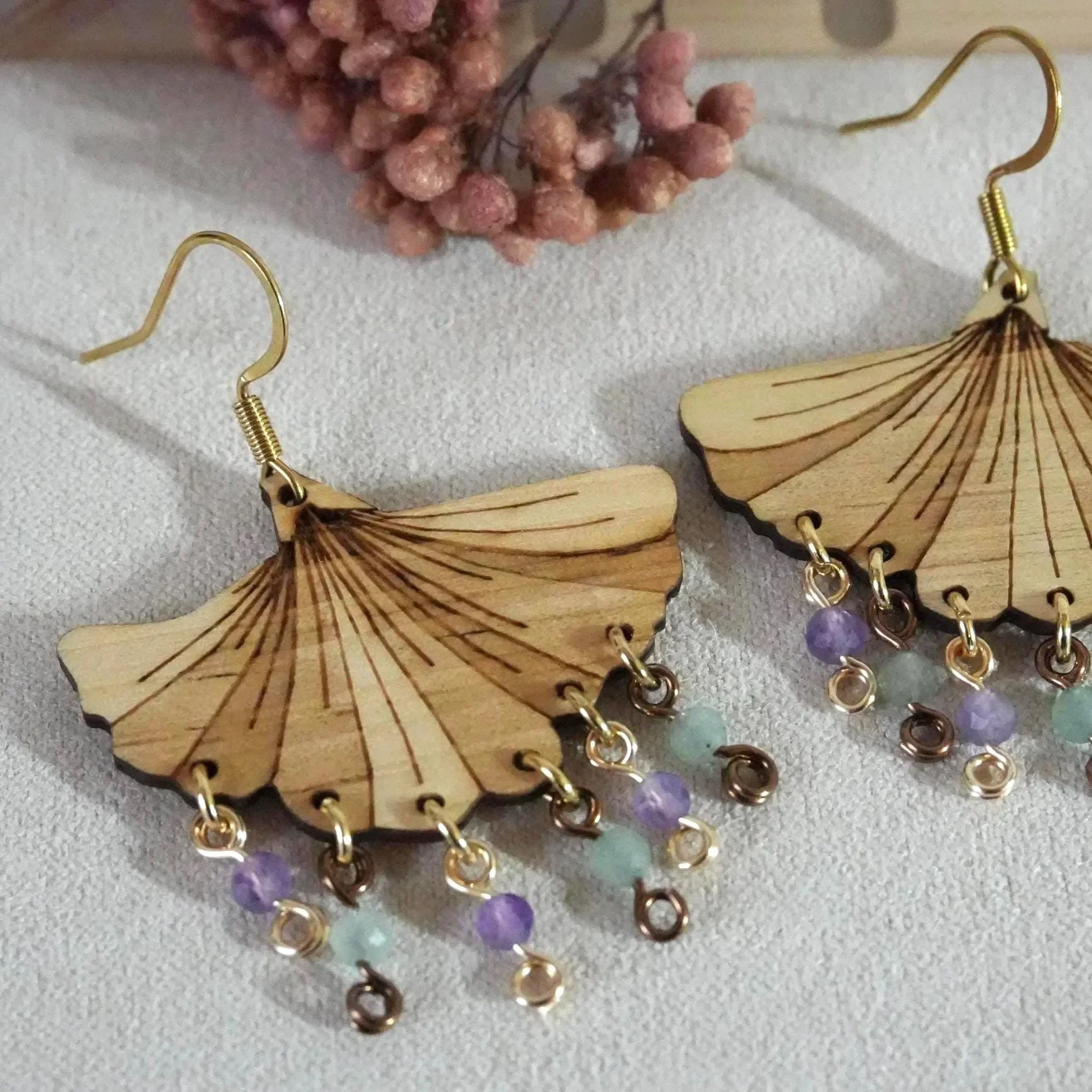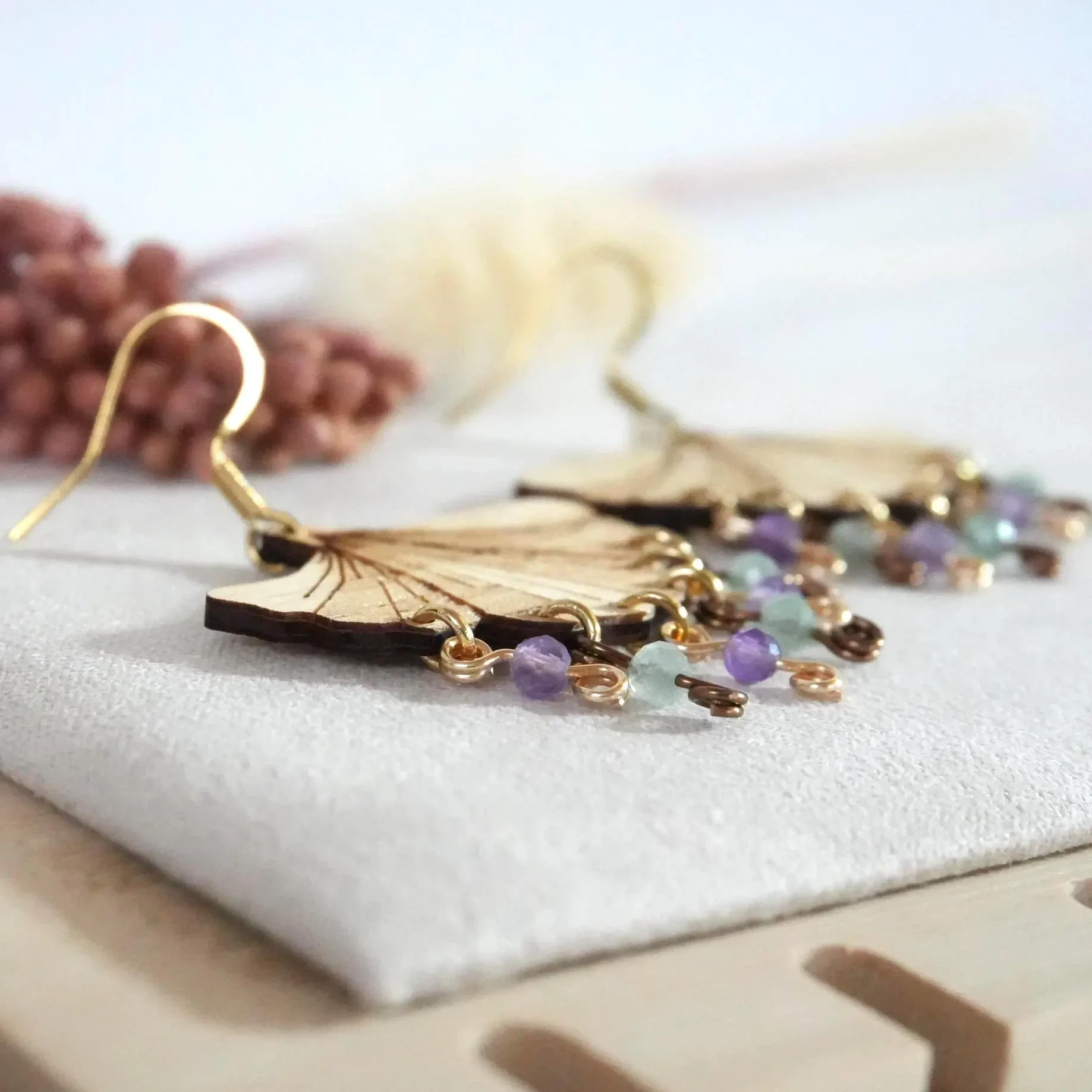 Diese handgefertigten Holzohrringe mit Ginkgoblatt-Anhänger vereinen die warme Energie von Zirbenholz mit der kraftvollen Symbolik von Amethyst und Aventurin. Die Natursteinperlen baumeln am Ginkgoblatt und sind mit vergoldeten Edelstahlringen sicher am Holzelement angebracht. Die Perlen selbst werden durch goldfarbenen bzw. bronzefarbenen Messingdraht gehalten. Die Edelstahl-Ohrhaken in Gold sind langlebig, hautfreundlich und perfekt für den Alltag oder besondere Anlässe.