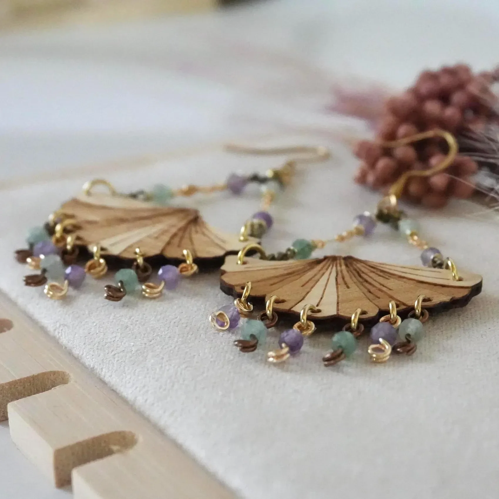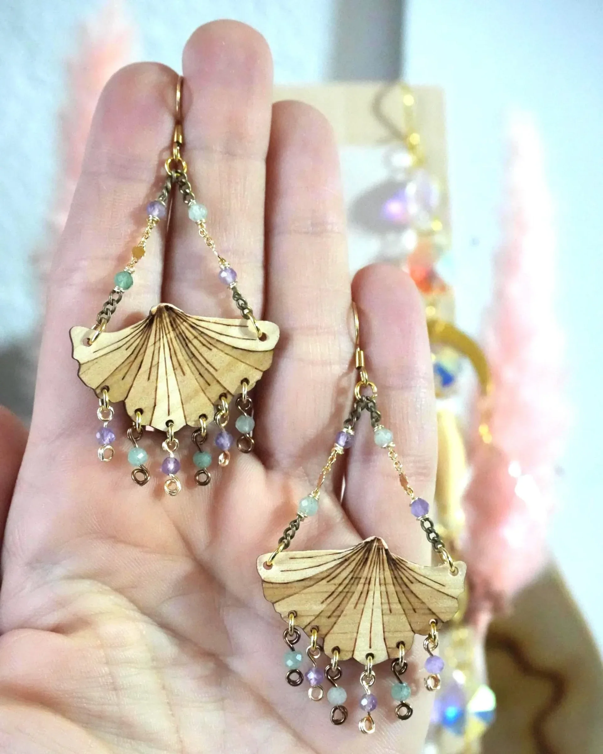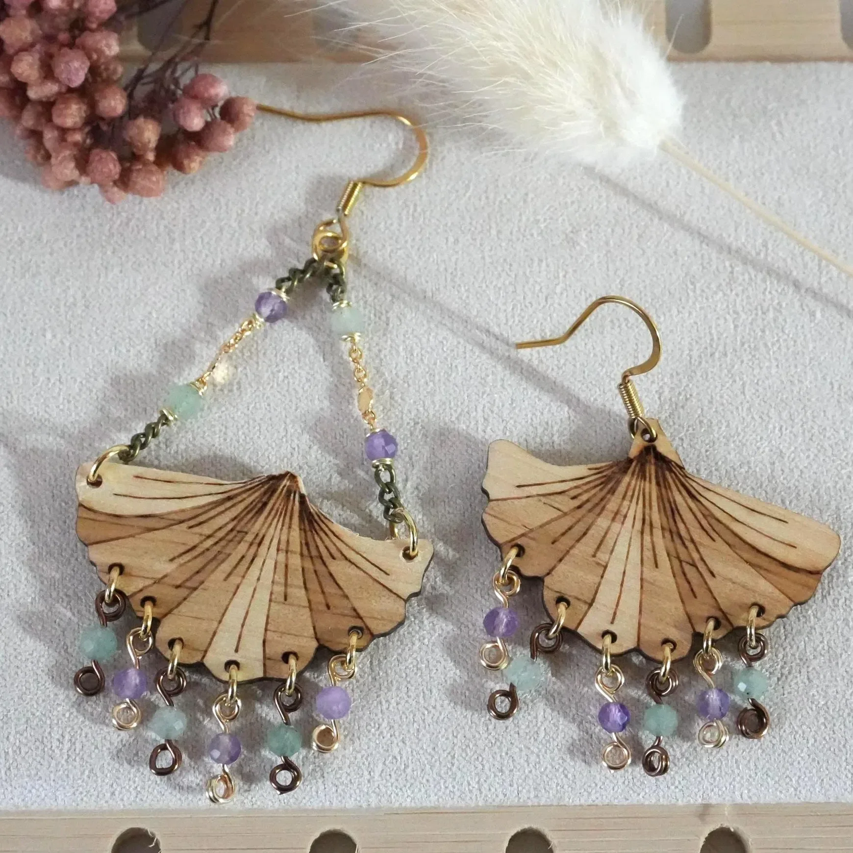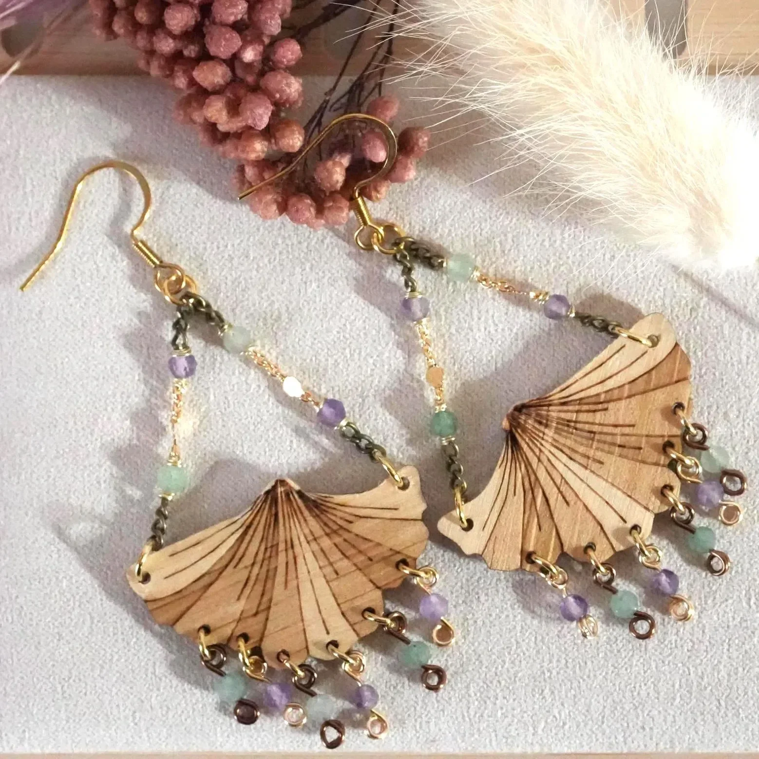 Diese handgefertigten Kronleuchter Ohrringe aus Holz mit einem Ginkgoblatt-Anhänger vereinen die warme Energie von Zirbenholz mit der kraftvollen Symbolik von Amethyst und Aventurin. Das gravierte Ginkgoblatt schwingt leicht an zwei mit Natursteinperlen verzierten Messing Ketten in Gold & Bronze an einem goldenen Edelstahl-Ohrhaken. Die Grünen & lilafarbenen Natursteinperlen baumeln am Ginkgoblatt und sind mit vergoldeten Edelstahlringen sicher am Holzelement angebracht. Die Perlen selbst werden durch goldfarbenen bzw. bronzefarbenen Messingdraht gehalten. Die Edelstahl-Ohrhaken sind langlebig, hautfreundlich und perfekt für den Alltag oder besondere Anlässe.